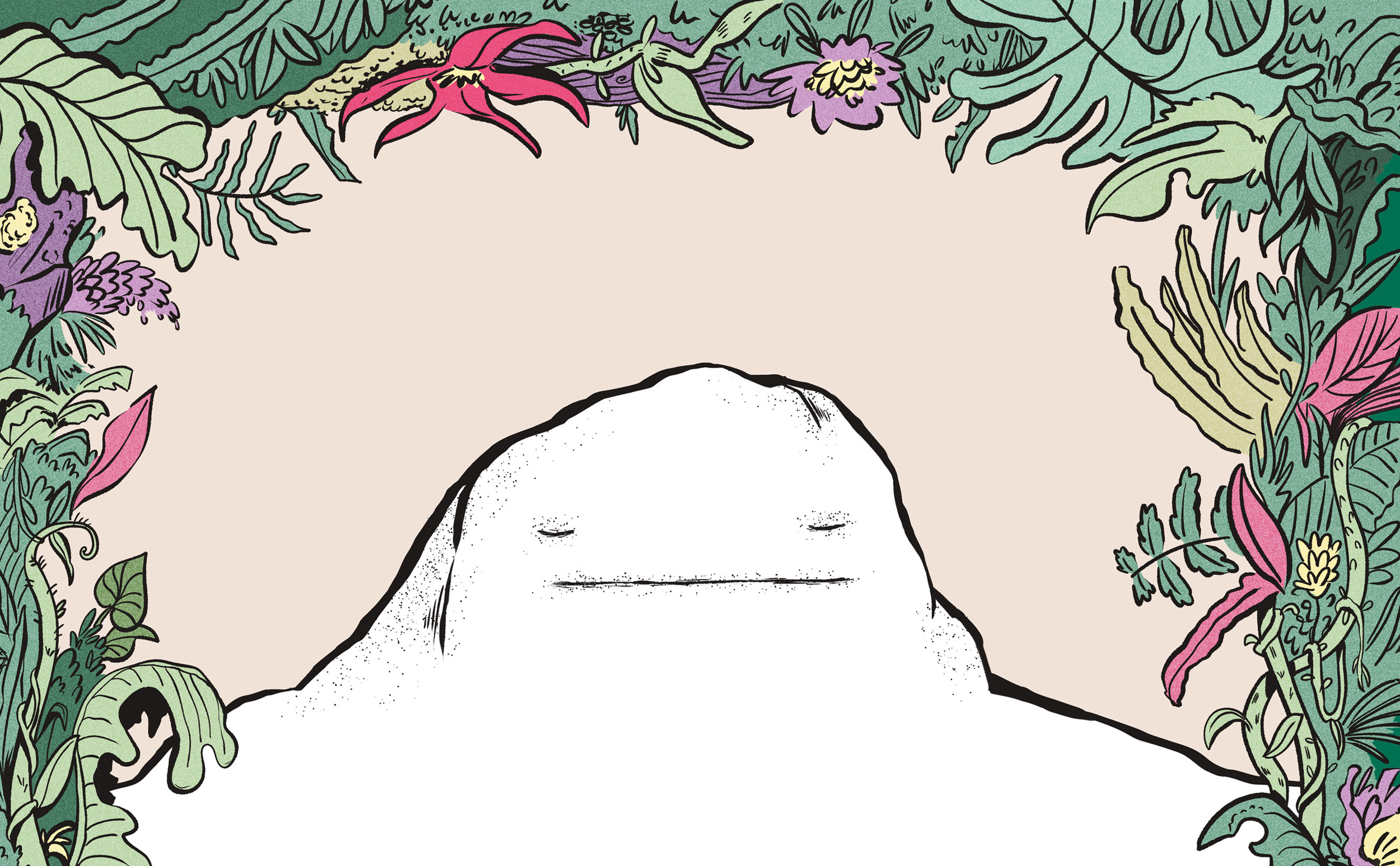 I've designed the cover to portray the life and hope that is at the book's core. A dust jacket conveys a premium feel – a lush frame of vegetation, highlighted with a high-gloss finish draws the audience in and centres focus on the mountain. The title typeface is timeless, yet approachable and copper-foiled accents in the illustration add to the luxe feel. Endpapers illustrated with pink skies provide a bold contrast with the luscious green of the dust jacket flaps. Peeking underneath the jacket, there is a moment of delight in finding the sleeping mountain awake on the book's boards and more elegant copper foil.